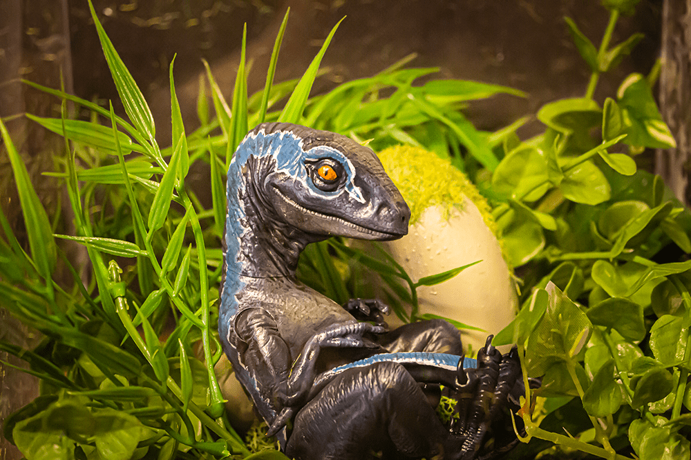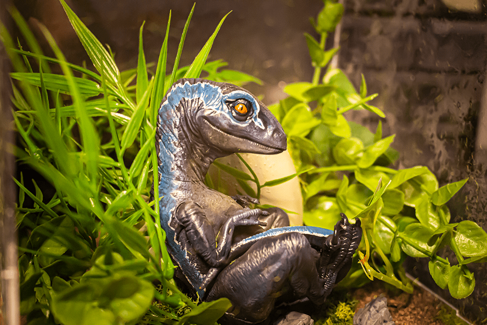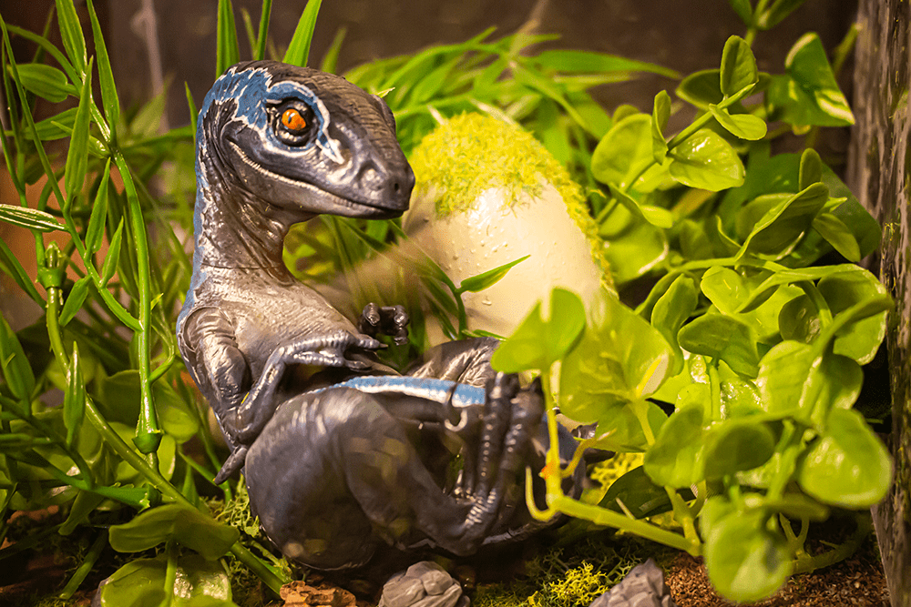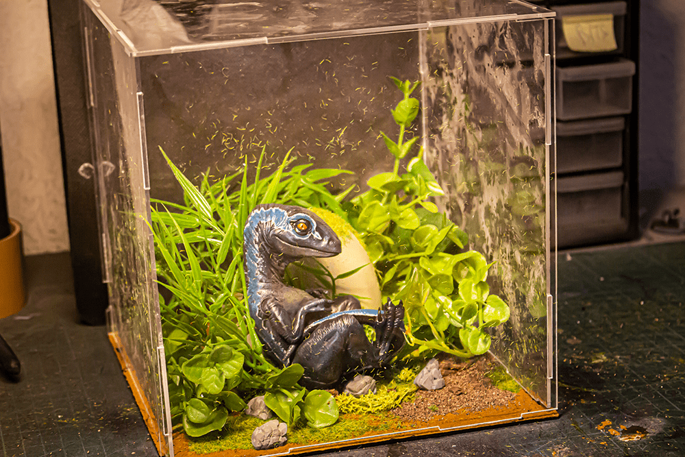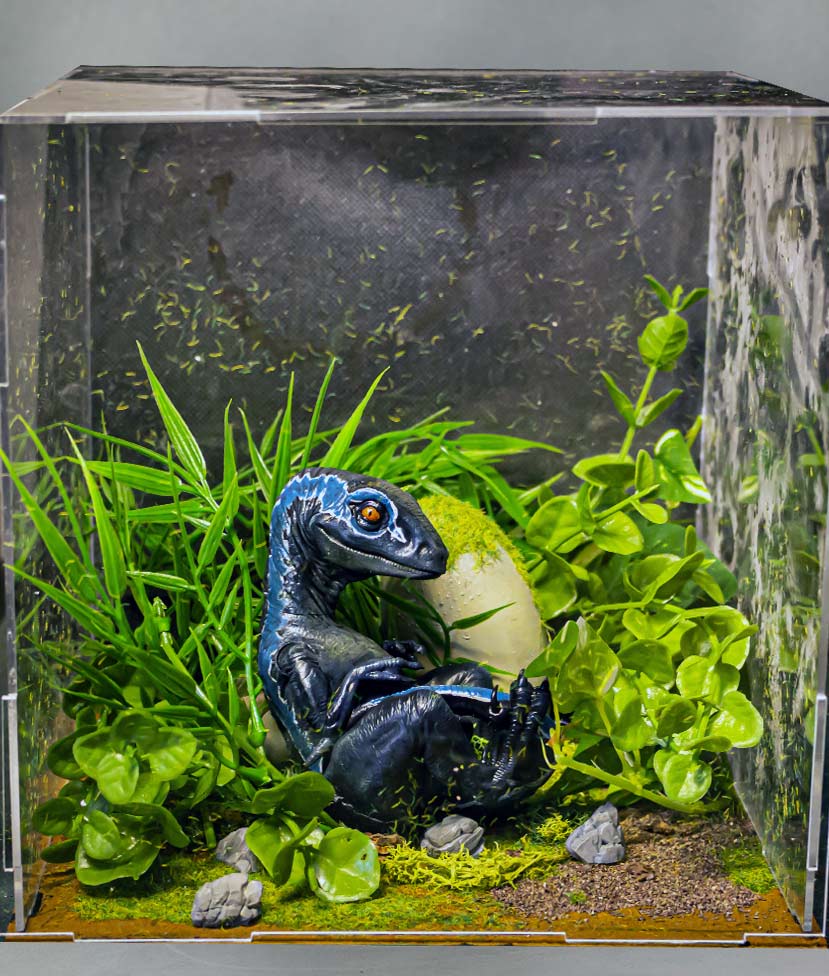 Para crear un entorno cautivador, el diorama cuenta con plantas imperecederas que añaden un toque de vida y autenticidad. La tierra artificial y las piedras impresas en resina complementan la escena, creando una representación tridimensional de los hábitats naturales de los velociraptores.