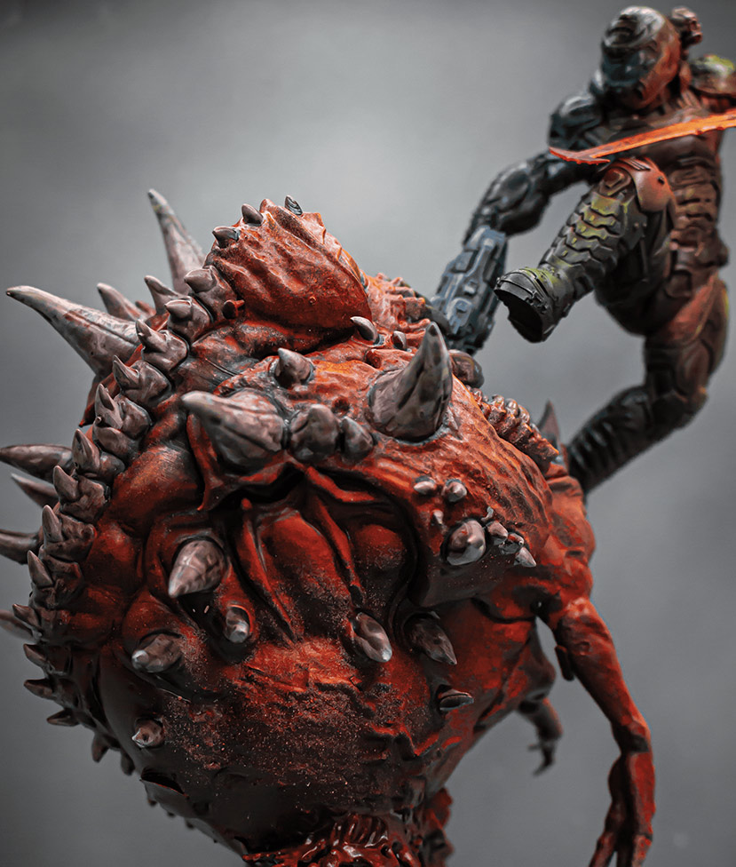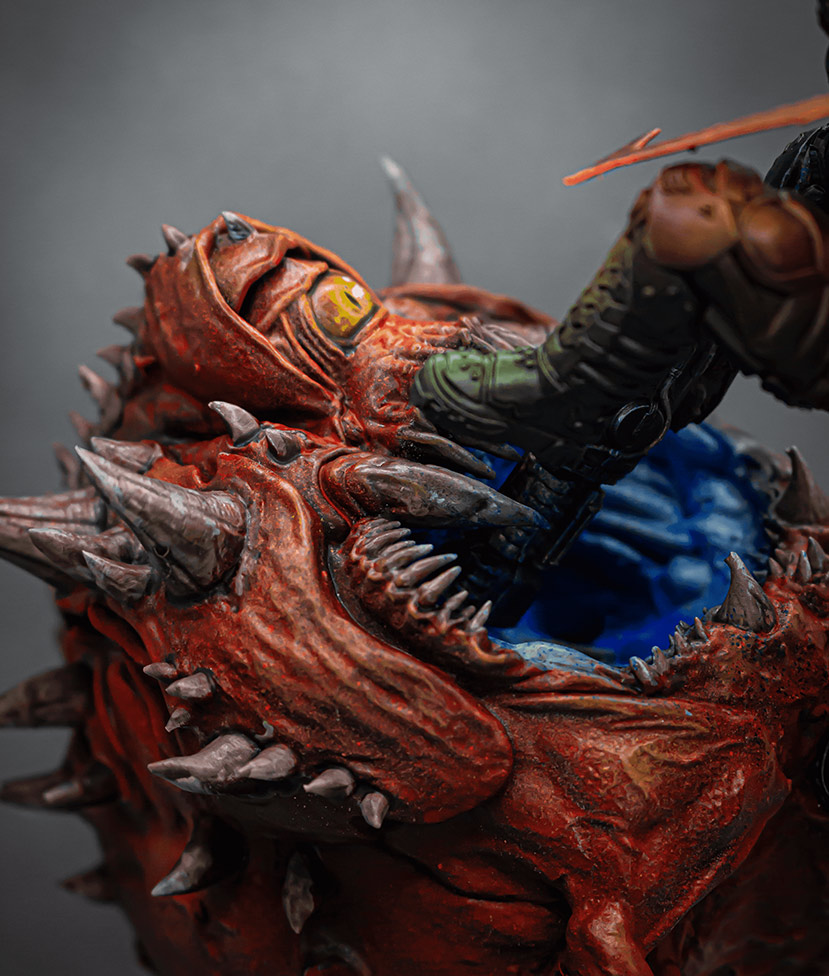 Además de ser un objeto de colección para los fanáticos de DOOM, esta figura también es una obra de arte en sí misma. Es un ejemplo perfecto de cómo la técnica de pintura manual puede crear algo verdaderamente impresionante. Esta figura es una pieza única y atemporal que durará generaciones. Además, la boca del cacodemonio está pintada con pintura que reacciona a la luz ultra violeta. De tal manera que, se ilumina cuando entra en contacto con luz ultravioleta.